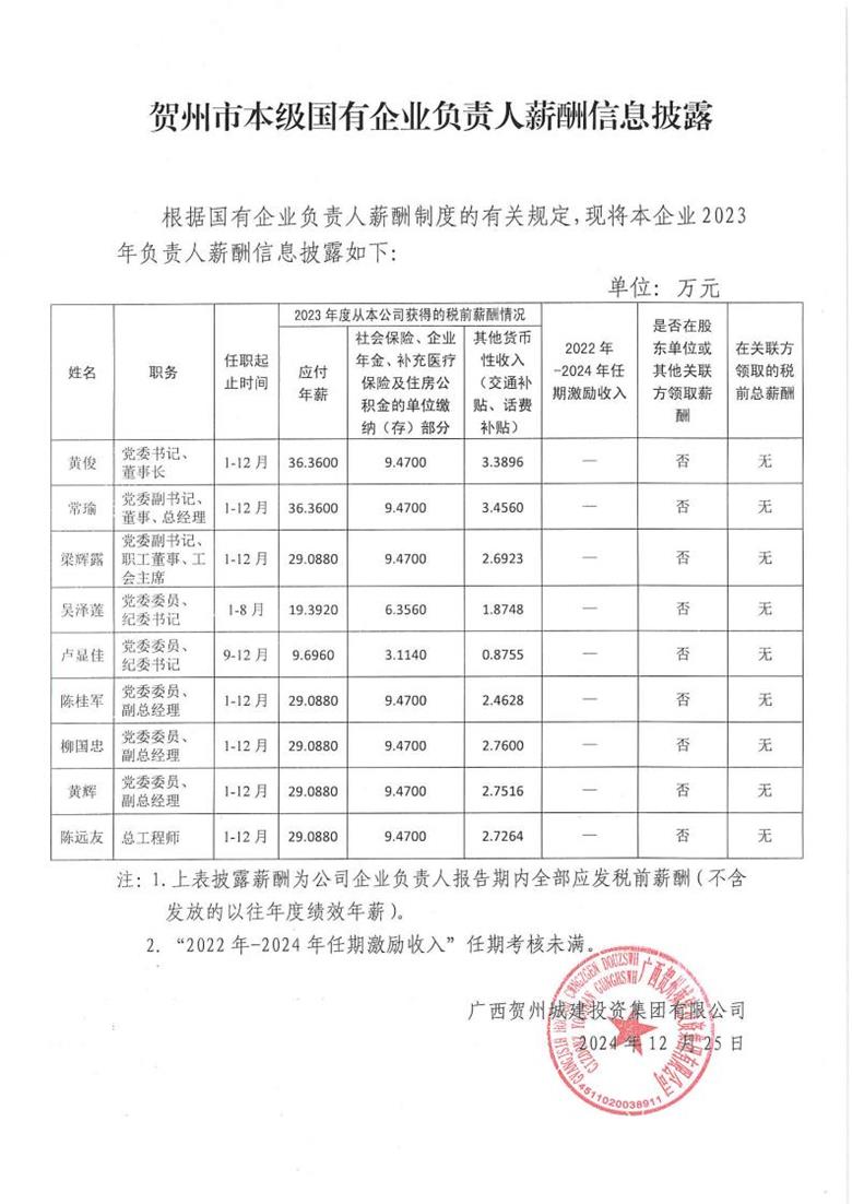 賀州市本級(jí)國(guó)有企業(yè)負(fù)責(zé)人薪酬信息披露2024-12-25